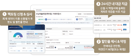 복잡한 절차 없이 팩토링 신청만으로 판매대금이 24시간 이내에 회수됩니다.